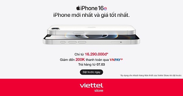 Viettel Stores sẽ chính thức mở cổng đặt trước iPhone 16e mới từ 28/02/2025, với thời gian mở bán bắt đầu từ 07/03/2025. Để biết thông tin chi tiết về giá cả và tình trạng sản phẩm, vui lòng truy cập Viettel Store – iPhone 16e.