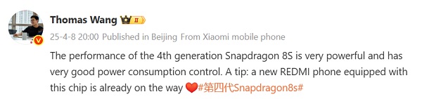 Redmi chính thức khởi động chiến dịch quảng bá cho mẫu smartphone sắp ra mắt Redmi Turbo 4 Pro. Trên nền tảng mạng xã hội Weibo, ông Wang Teng Thomas, Tổng Giám đốc thương hiệu Redmi, đã dành nhiều lời khen ngợi cho hiệu năng vượt trội và khả năng tiết kiệm năng lượng ấn tượng của vi xử lý Snapdragon 8s Gen 4. Đồng thời, ông cũng xác nhận rằng Redmi Turbo 4 Pro sẽ là sản phẩm đầu tiên được trang bị con chip này.