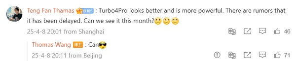 Khi được một người dùng hỏi về khả năng ra mắt Redmi Turbo 4 Pro trong tháng 4, ông Wang Teng Thomas đã trả lời ngắn gọn: “có thể.” Câu trả lời này như một lời gợi ý đầy ẩn ý, cho thấy rất có khả năng Redmi Turbo 4 Pro sẽ chính thức trình làng ngay trong tháng này.