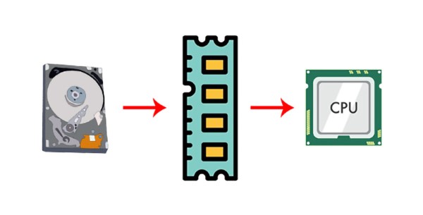 Khi người dùng mở một ứng dụng trên thiết bị, dữ liệu của phần mềm sẽ được truyền từ ổ cứng và lưu trữ tại RAM, lúc này CPU sẽ truy xuất dữ liệu từ RAM để hiển thị phản hồi lại thao tác của người dùng.
