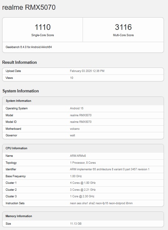 realme 14 ghi được 1.110 điểm trong bài kiểm tra đơn nhân và 3.116 điểm ở bài kiểm tra đa nhân trên GeekBench. Bên cạnh đó, danh sách từ GeekBench tiết lộ rằng thiết bị sẽ được cài sẵn hệ điều hành Android 15 ngay khi ra mắt. Ngoài ra, realme 14 sẽ có ít nhất một tùy chọn bộ nhớ với 12GB RAM, hứa hẹn mang đến trải nghiệm mượt mà cho người dùng.