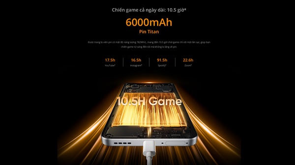 Được trang bị pin Titan với dung lượng ấn tượng lên đến 6000mAh, realme 14 5G dẫn đầu về công nghệ pin trên smartphone trong cùng phân khúc. Thiết bị mang đến thời lượng sử dụng ấn tượng với 10.5 giờ chơi game liên tục và 17,5 giờ xem video không ngắt quãng. Bên cạnh đó, realme 14 5G còn sử dụng pin than chì có mật độ năng lượng cao nhất trong ngành – đạt 782Wh/L, đảm bảo độ bền vượt trội, duy trì hiệu suất ổn định ngay cả sau 1.400 chu kỳ sạc.