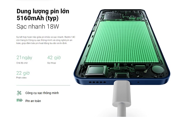 Một trong những yếu tố không thể bỏ qua khi đánh giá một chiếc smartphone chính là thời lượng pin. Redmi 14C được trang bị viên pin dung lượng lớn 5.160mAh đủ sức hoạt động trong cả ngày dài với các tác vụ thông thường. Ngoài ra, máy còn hỗ trợ sạc nhanh có dây 18W giúp rút ngắn thời gian chờ đợi khi sạc pin.