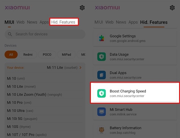 Bước 2: Sau khi người dùng đã cài đặt thành công MIUI Downloader >>mở ứng dụng lên. Tại giao diện chính của ứng dụng >> tìm và chọn mục Hid. Features. Đây chính là nơi tập hợp những tính năng đặc biệt mà người dùng có thể kích hoạt để có thể tối ưu hóa được trải nghiệm sử dụng điện thoại của mình.