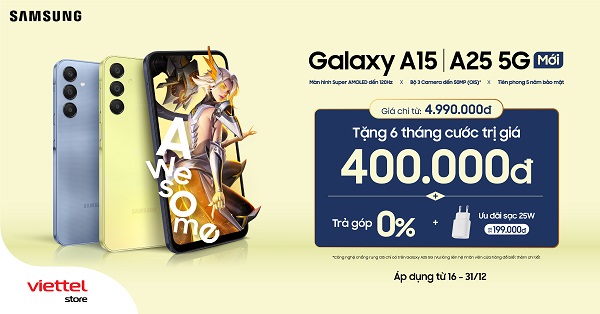 Hôm nay, Viettel Store chính thức mở bán bộ đôi Galaxy A15 và Galaxy A25 5G với giá bán chỉ từ 4.990.000 đồng. Đặc biệt, trong thời gian mở bán, khi mua hai sản phẩm này bạn sẽ nhận được nhiều ưu đãi hấp dẫn đi kèm.