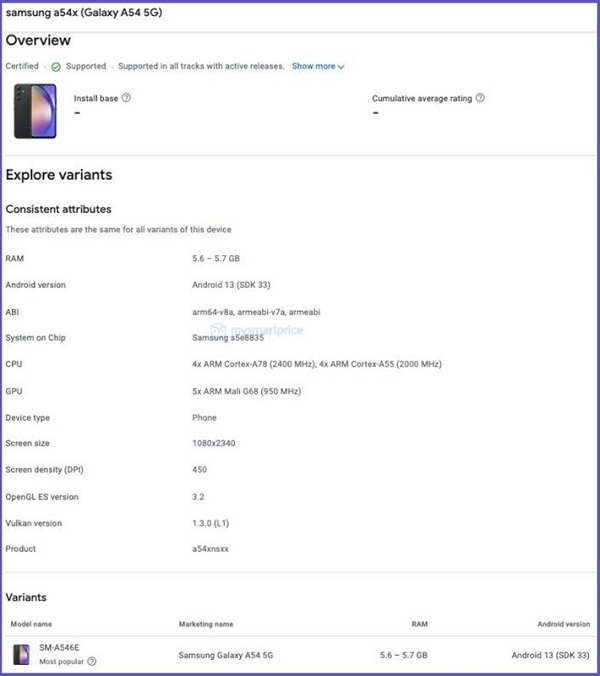Thông tin từ trang MySmartPrice cho biết Samsung Galaxy A54 5G xuất hiện trên Google Play Console với số model SM-A546E. Bên cạnh đó, điện thoại sẽ được trang bị màn hình Full HD+ với thiết kế đục lỗ và cụm 3 camera xếp dọc mặt lưng.