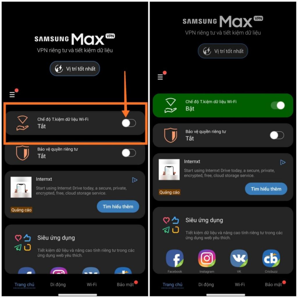 Bạn có thể bật tính năng này bằng cách truy cập vào ứng dụng Samsung Max và kích hoạt Chế độ tiết kiệm dữ liệu Wi-Fi hay Chế độ tiết kiệm dữ liệu di động.