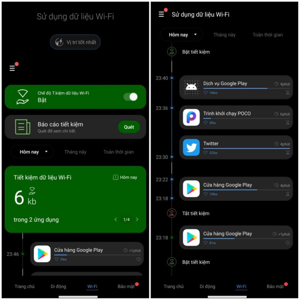 Sau khi bật tính năng này, Samsung Max sẽ hiển thị các báo cáo chi tiết trực quan về tần suất số lượng dữ liệu đã được tiết kiệm của mỗi ứng dụng. Bạn có thể kiểm tra các báo cáo chi tiết này bằng cách truy cập vào biểu tượng ba gạch > Nhấn chọn vào Sử dụng dữ liệu di động hoặc Sử dụng dữ liệu Wi-Fi.