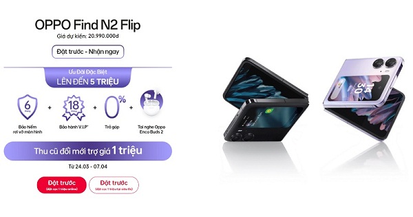 Dự kiến, OPPO Find N2 Flip sẽ được bán ra tại các siêu thị Viettel Store với mức giá là 20.990.000 đồng dành cho phiên bản RAM 8GB và bộ nhớ trong 256GB. Có thể nói đây là mức giá khá phải chăng so với các thị trường nước ngoài, chẳng hạn như OPPO Find N2 Flip ở thị trường toàn cầu có giá khoảng 24.400.000 đồng, ở thị trường Đài Loan là 24.3000.000 đồng và ở thị trường Singapore là 22.800.000 đồng.