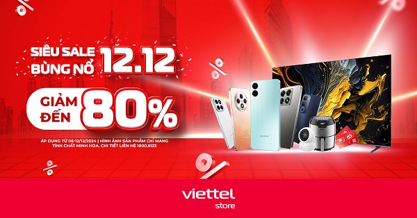 Từ ngày 06/12 – 12/12/2024, Viettel Store triển khai chương trình “Siêu sale bùng nổ 12/12 – Giảm đến 80%” áp dụng với nhiều mẫu điện thoại, gia dụng, phụ kiện, SIM số đẹp cùng ưu đãi đi kèm hấp dẫn.