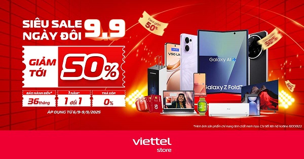 Cơ hội vàng săn sale ngày đôi 9/9 mua sắm thả ga với mức ưu đãi cực khủng tại Viettel Store! Hàng loạt sản phẩm hấp dẫn giảm giá lên tới 50%, giúp bạn dễ dàng sở hữu những món đồ yêu thích với chi phí tiết kiệm nhất. Đừng bỏ lỡ ngày hội mua sắm lớn nhất tháng 9 này!