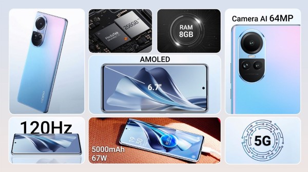OPPO Reno10 vẫn giữ được thiết kế vuông vức tương tự như phiên bản tiền nhiệm, với phần mô-đun camera ở phía mặt lưng hình elip khá nổi bật. Về mặt hình ảnh, máy sở hữu tấm nền 3D AMOLED 6.7inch, tần số quét lên tới 120Hz, mang lại sự mượt mà, và chân thực trong từng khung hình hiển thị.