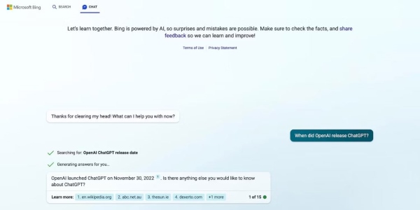 Điểm khác biệt này có thể xuất phát từ bộ dữ liệu. Theo đó, ChatGPT có kiến thức hạn chế về các sự kiện kể từ sau năm 2021 đến nay. Ngược lại, Bing AI không được đào tạo trên các bộ dữ liệu hạn chế mà sử dụng công cụ tìm kiếm của mình để lấy thông tin trả lời những câu hỏi.