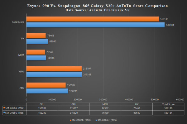 Khi so sánh 2 dòng chip Exynos 990 và Snapdragon 865 cùng trang bị trên Galaxy S22 của Samsung ra mắt năm 2020 có thể thấy chip Exynos 990 cho hiệu suất không quá ấn tượng. Trong khi, chip Snapdragon 865 sở hữu CPU đa lõi và hiệu suất đồ họa tốt hơn.