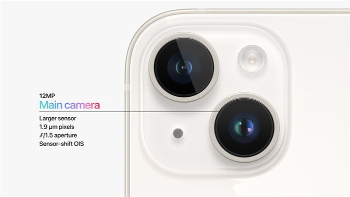 iPhone 14 được trang bị cụm camera kép mặt sau với camera chính 12 MP, hỗ trợ chống rung OIS, camera góc rộng 12MP, hỗ trợ zoom quang 2x và zoom kỹ thuật số 5x và camera trước có độ phân giải 12 MP.