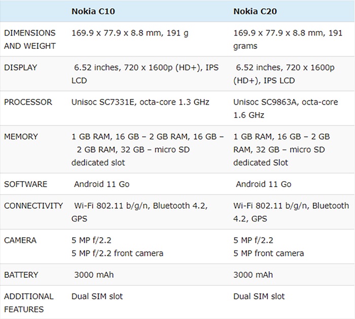 Cả Nokia C10 và C20 đều được trang bị chip do Unisoc sản xuất. Tuy nhiên, Nokia C10 chạy chip SoC Unisoc SC7331E còn Nokia C20 chạy chip Unisoc SC9863A. Điều này cho thấy hiệu năng của 2 máy sẽ khác nhau, cụ thể C20 cho hiệu năng mạnh mẽ hơn C10 bởi vì chip SC9863A có 8 nhân còn SC7331E chỉ có 4 nhân. Tốc độ xung nhịp cũng cao hơn.