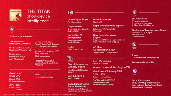 - Qualcomm cho biết NPU Hexagon của chip Snapdragon 8 Gen 3 cung cấp hiệu năng gần gấp đôi và hiệu quả hơn 40% so với chip cũ, đồng thời được thiết kế dành cho Generative AI.