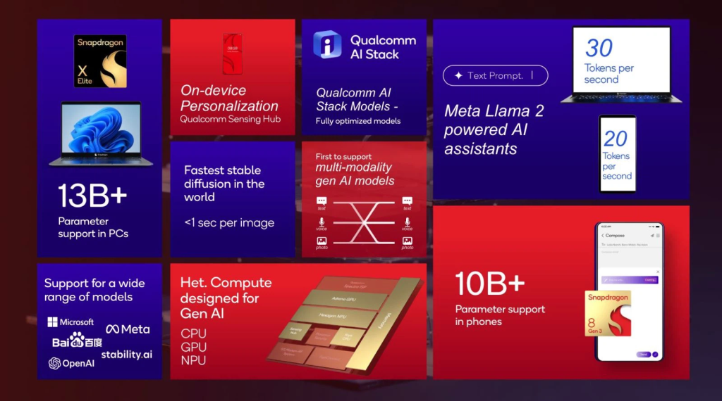 - Dòng chip mới có khả năng chạy các mô hình ngôn ngữ lớn (LLM) trên thiết bị. Bản demo chatbot đã trình làng và được hỗ trợ bởi mô hình ngôn ngữ Llama 2 của Meta.