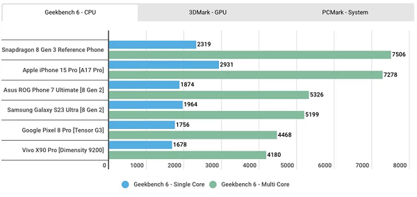 Kết quả cho thấy ở phần mềm GeekBench 6, chip Snapdragon 8 Gen 3 thể hiện số điểm chuẩn ấn tượng và khá phù hợp với số liệu hiệu suất mà Qualcomm đã tuyên bố. Dòng chip mới mang đến mức tăng 40% về hiệu suất đa lõi và 18% về hiệu đa lõi đơn so với các smartphone chạy chip Snapdragon 8 Gen 2.