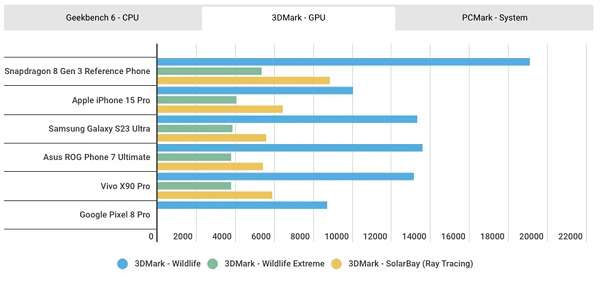 Kết quả đo hiệu năng GPU thông qua bài test 3DMark Wild Life cho thấy chip Snapdragon 8 Gen 3 tốt hơn 40% so với chip Snapdragon 8 Gen 2 và vượt xa mức 25% do Qualcomm công bố.