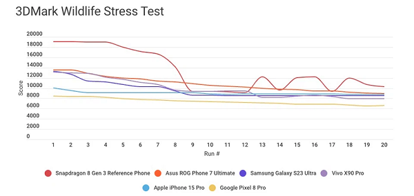 Lưu ý: Dù chip Snapdragon 8 Gen 3 có khởi đầu mạnh mẽ song hiệu suất cao nhất lại giảm xuống một nửa sau vài lần thực hiện bài test 3DMark Wildlife Stress Test. Như vậy, hiệu suất của dòng chip sau này sẽ giảm dần theo thời gian.