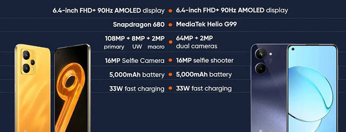 Còn bản tiền nhiệm Realme 9 dường như được trang bị một hệ thống camera tốt hơn gồm cảm biến chính Samsung ISOCELL HM6 với độ phân giải lên tới 108MP, đi kèm cảm biến cho góc chụp siêu rộng 8MP với FoV 119 độ và camera macro 2MP với khẩu độ f/2.4. Mặt trước máy cũng được trang bị camera selfie 16MP.