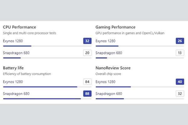 Samsung Galaxy A25 5G sử dụng chip cây nhà lá vườn Exynos 1280 nhưng lại cho hiệu năng vượt trội so với chip Snapdragon 680 4G trên OPPO A78. Các bài test về hiệu năng giữa hai con chip này đã chứng minh điều này. Vì vậy, khi sử dụng A25 5G người người sẽ có cảm giác mượt mà hơn, ít bị giật và lag.