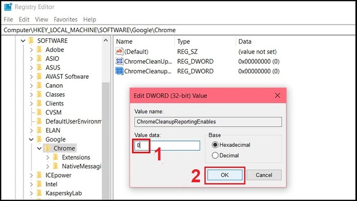 – Bước 5: Nháy đúp chuột vào mục ChromeCleanupEnabled vừa tạo > Trong ô Value data, nhập giá trị 0 > Nhấn OK.