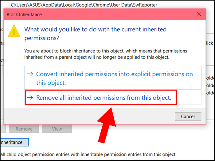 – Bước 4: Từ cửa sổ mới hiện chọn Remove all inherited permissions from this object để xoá tất cả các quyền hoạt động của Software Reporter > Sau đó, nhấp Apply và nhấn OK.