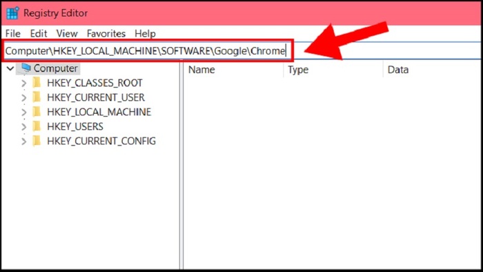 + Bước 2: Hãy copy đường dẫn “Computer\HKEY_LOCAL_MACHINE\SOFTWARE\Google\Chrome” > Trên thanh địa chỉ của Registry dán đường link vừa copy vào > Nhấn Enter.
