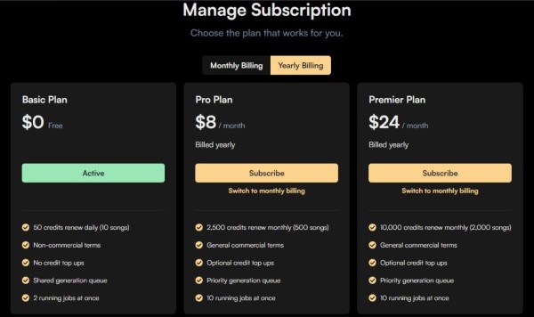 Bạn hoàn toàn có thể sử dụng Suno AI miễn phí hoặc đăng ký gói trả phí theo nhu cầu để sử dụng các tính năng mở rộng của Suno AI. Hiện tại thì Suno AI đang cung cấp hai gói thu phí để phục vụ người dùng, gồm có gói Pro có giá 8 USD/tháng, cho phép tạo ra tối đa 500 bài hát, cùng gói Premier có giá 24 USD/tháng và cho phép khởi tạo tối đa lên đến 2.000 bài hát.