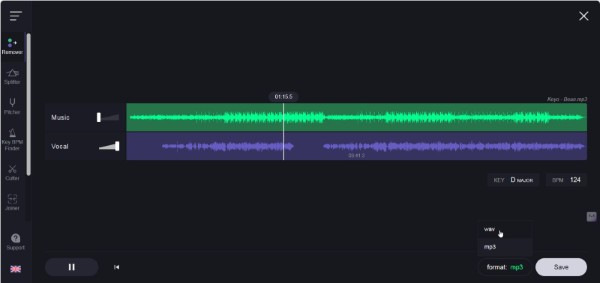 Để tải file đã xử lý, chọn định dạng mong muốn tại mục Format, sau đó nhấn Save ở góc dưới bên phải để tải về. Nếu bạn chỉ muốn lưu lại phần lời bài hát, hãy kéo thanh Music về bên trái trước khi tải.