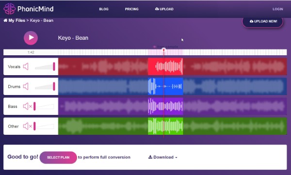 Bước 4: Khi hoàn tất, PhonicMind cung cấp nhiều tùy chọn điều chỉnh âm thanh với 4 biểu đồ sóng đại diện cho 4 thành phần khác nhau. Người dùng có thể điều chỉnh bằng cách kéo thanh trượt âm lượng từ trái sang phải để bật hoặc từ phải sang trái để tắt.