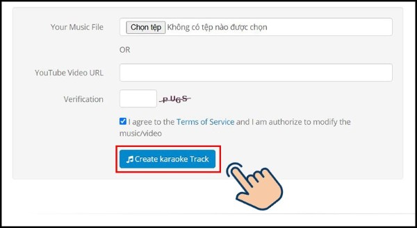 Bước 1: Truy cập Vocal Remover Pro, chọn “Chọn tệp” để tải file từ máy tính hoặc dán liên kết YouTube vào ô “YouTube Video URL”. Sau đó nhập mã xác nhận và nhấn “Create Karaoke Track”.