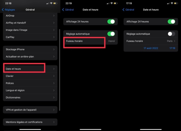 Bước 6: Quay lại Cài đặt chung, bạn chọn mục Ngày và giờ. Tại mục này, bạn hãy bấm tắt Đặt tự động > chọn lại Múi giờ đúng với quốc gia bạn đã chọn.