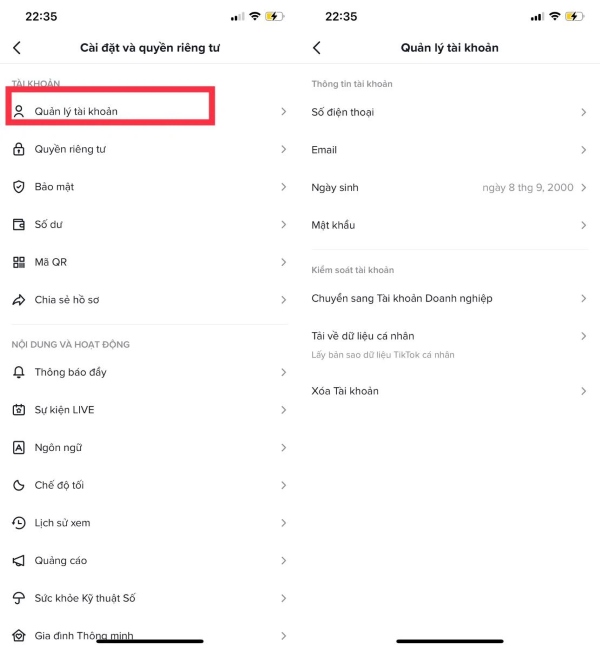 Bước 8: Tại mục Cài đặt và quyền riêng tư, bạn chọn Quản lý tài khoản. Nếu tài khoản bạn đủ điều kiện bạn sẽ nhìn thấy mục Chuyển sang tài khoản Pro.