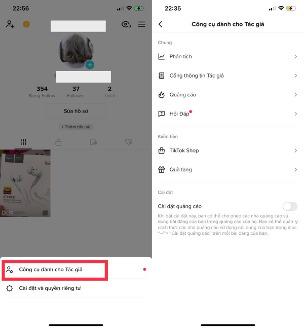 Bước 9: Quay lại và bấm một lần nữa vào biểu tượng 3 dấu gạch ngang trên góc phải màn hình > chọn Công cụ dành cho tác giả. Nếu tài khoản bạn đủ điều kiện bạn sẽ nhìn thấy mục Quỹ nhà sáng tạo TikTok.