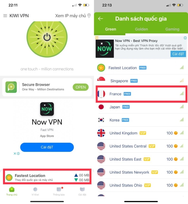 Bước 1: Tải ứng dụng Kiwi VPN về điện thoại của bạn. Sau đó, bạn mở ứng dụng lên > nhấn vào mục Fastest Location để chuyển sang quốc gia mà bạn muốn làm giả IP. Trong các quốc gia hiện tại ứng dụng đang cung cấp chuyển đổi IP miễn phí, bạn có thể chọn các quốc như Pháp, Mỹ, Anh, Đức, Tây Ban Nha.