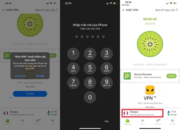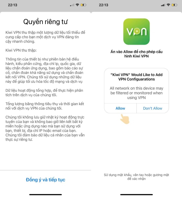 Bước 2: Đọc các điều khoản Quyền riêng tư, nếu đồng ý bấm Allow để cho phép Kiwi truy cập vào VPN của điện thoại.