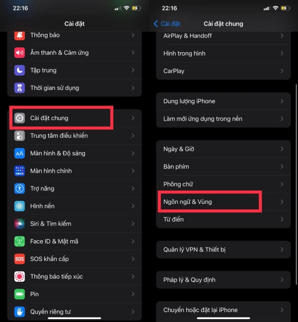 Bước 4: Vào cài đặt của điện thoại, bạn chọn Cài đặt chung > chọn tiếp Ngôn ngữ và vùng.
