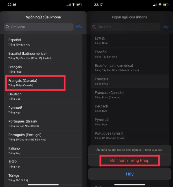 Bước 5: Tại đây bạn chọn Ngôn ngữ của iPhone giống với ngôn ngữ quốc gia bạn chuyển đổi sang. Ví dụ, chọn Tiếng Pháp > chọn Đổi thành Tiếng Pháp để xác nhận lại lần nữa.