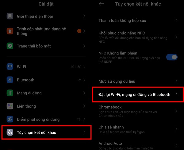 Người dùng hãy vào Cài đặt >> Chọn vào mục Tùy chọn kết nối khác >> Hãy tiến hành Đặt lại Wi-Fi, mạng di động và Bluetooth >> Đặt lại chế độ cài đặt >> Nhập mật khẩu khóa điện thoại (nếu có) và xác nhận là xong.