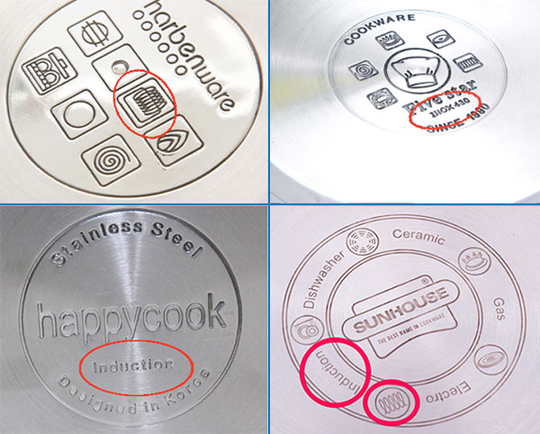 – Kiểm tra kỹ xem nồi có ký hiệu được phép dùng cho bếp từ không: Hầu hết các nhà sản xuất nồi, chảo đều thể hiện ký hiệu rõ ràng các loại bếp có thể sử dụng được. Với bếp từ sẽ có ký hiệu Induction, hình lò xo hoặc hình vòng tròn dưới đáy nồi.