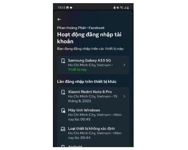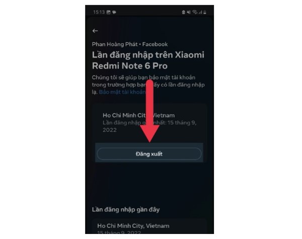 Truy cập ứng dụng Facebook > Chọn vào biểu tượng avatar > Cài đặt > Chọn tiếp vào Mật khẩu và bảo mật > Nơi bạn đăng nhập > Chọn vào ô đầu tiên > Thiết bị > Thực hiện Đăng xuất.