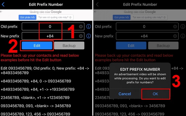 Bước 2: Nhập 0 vào ô “Old Prefix” >>nhập +84 vào ô “New Prefix” >> Chọn Edit >> Nhấn OK để tiếp tục và sau đó chờ quá trình chuyển đổi được hoàn tất.