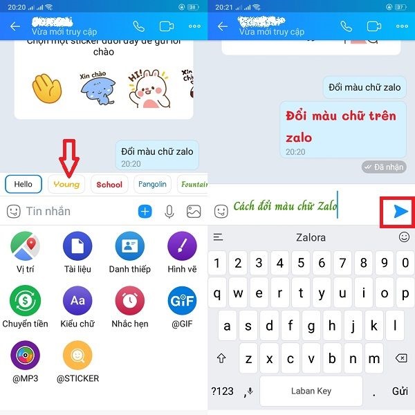 Bước 2: Tại đây có tới 28 màu chữ khác nhau cho người dùng lựa chọn. Người dùng hãy kéo sang bên phải để xem được nhiều màu chữ hơn. Xác định chọn được màu chữ mà bạn ưng ý, sau đó soạn tin nhắn. Lúc này tin nhắn sẽ tự động chuyển sang màu chữ trong khi người dùng soạn tin. Cuối cùng người dùng hãy nhấn vào mũi tên màu xanh để gửi tin nhắn đó cho bạn bè của mình.