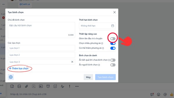 Lưu ý: Nếu cần thêm nhiều lựa chọn hơn, bạn có thể nhấn vào “Thêm lựa chọn”. Ngoài ra, bạn cũng có thể ghim cuộc bình chọn lên đầu cuộc trò chuyện để giúp mọi người dễ dàng nhìn thấy hơn bằng cách bật tính năng này.