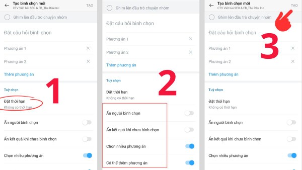 Bước 3: Sau khi điền đầy đủ thông tin, bạn có thể thiết lập thời gian kết thúc bình chọn. Ngoài ra, có thể bật các tùy chọn như cho phép thành viên thêm phương án mới hoặc chọn nhiều đáp án cùng lúc. Cuối cùng, nhấn “Tạo” để hoàn tất và lưu cuộc bình chọn.