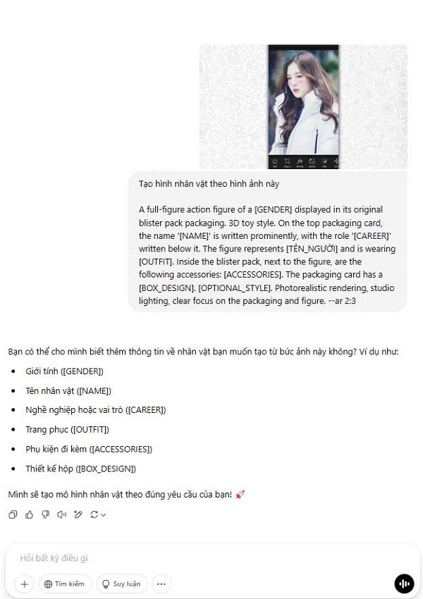 Với các phần [mô tả], bạn có thể nhập thông tin bằng tiếng Việt hoặc tiếng Anh. Và nếu bạn muốn tạo nhân vật từ chính hình ảnh của mình, chỉ cần tải ảnh lên và gửi kèm trong chatGPT là xong.