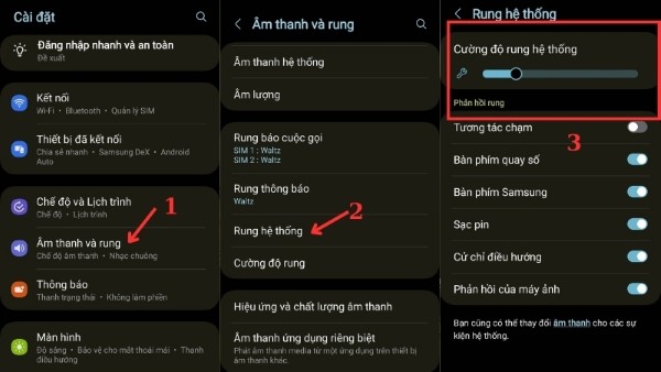 – Điều chỉnh cường độ rung: Vào Cài đặt -> Chọn Âm thanh và rung -> Mở Rung hệ thống -> Dùng thanh trượt trong phần Cường độ rung hệ thống để tăng hoặc giảm mức độ rung phù hợp với nhu cầu sử dụng của bạn.